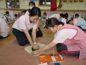 もんもん保育園、苗・もんもん保育園、花もんもん保育園、の3園合同で7/6(土)に心肺蘇生法の研修を行いました。